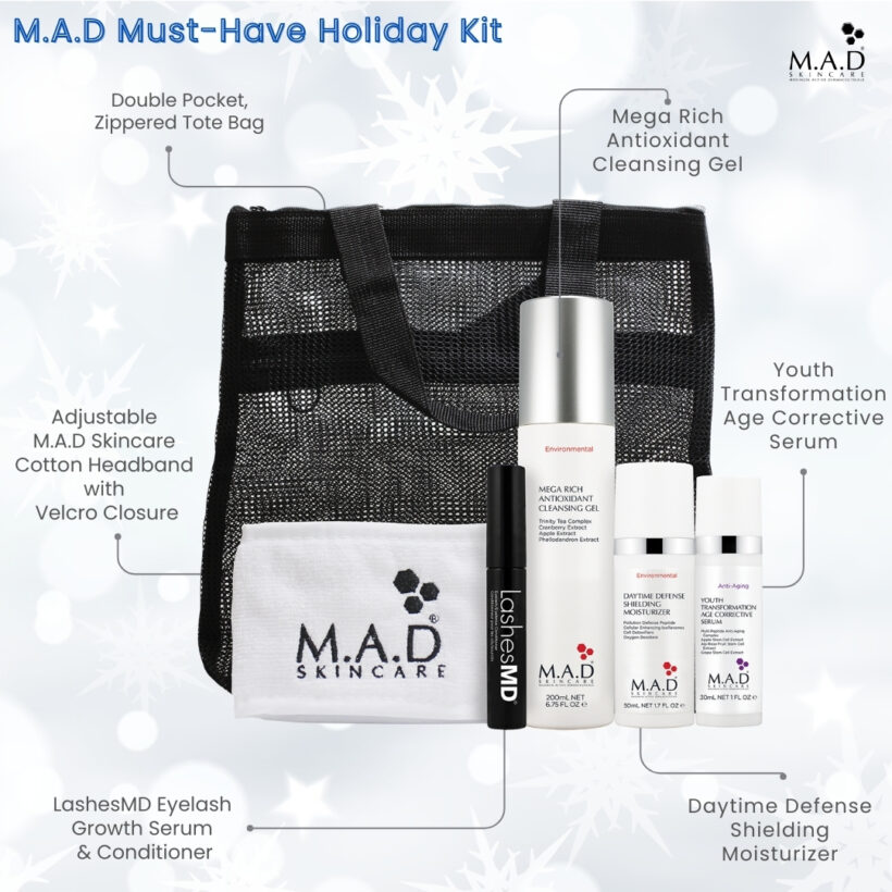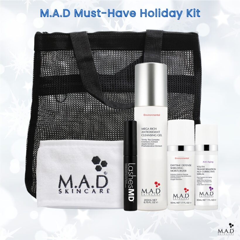 Make this holiday season one filled with radiant skin must-haves and glowing vibes! A carefully curated holiday set filled with beauty essentials, M.A.D’s Must-Have Holiday Kit brings healthier, brighter, younger-looking skin, luscious lashes, luxurious lips, and accessories that’s all about self-care and radiance. It’s more than just products; it’s a spacious travel bag filled to feels festive!